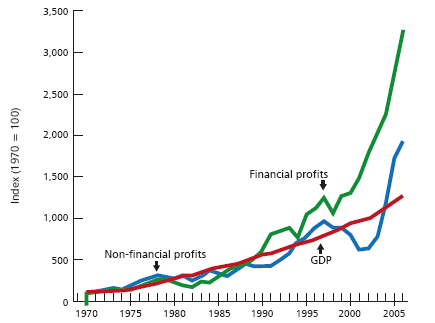 Graph 1. Growth of financial and nonfinancial profits relative to GDP (1970 = 100)