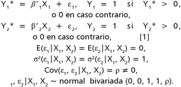 Conviene advertir que, igual que en los modelos de elección binaria convencionales, en los modelos bivariados los coeficientes estimados (ßi) son poco informativos, debido a que no cuantifican directamente el cambio que experimentan sus probabilidades de ocurrencia ante un cambio marginal de X1 yX2, respectivamente. Para conocer la magnitud del cambio de Y1 y Y2, es preciso calcular el efecto marginal de una variación unitaria en cualquiera de las variables de X1 y X2. Esto se logra mediante la evaluación de las derivadas parciales (∂Y1/∂X1y ∂Y2/∂X2) en el punto medio de las variables independientes2, de modo que la variación en las probabilidades bivariantes viene dada por: