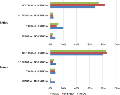 Cuando se contrasta la participación laboral con la asistencia escolar (figura 1), es posible advertir que el 3,12% de los menores se dedica exclusivamente a trabajar, una gran mayoría se dedica únicamente a estudiar (81,7%), el 10,1% de los menores combina ambas actividades, mientras que el 5,1% no realiza ninguna de las dos. Esta tendencia se mantiene al analizar cada género por separado, aunque se evidencian algunas brechas urbano-rurales. Las diferencias de proporción son positivas para las niñas rurales cuando se contempla la posibilidad de no realizar ninguna de las dos actividades (7,96%), mientras los niños rurales son mayoría en el grupo de menores que trabajan, ya sea que combinen o no esta actividad con estudiar (19,82% y 7,69%, respectivamente). Por el contrario, las diferencias de proporción favorecen a las niñas en zonas urbanas en el grupo de quienes solo se dedican a estudiar (86,97%). De lo anterior, se infiere a priori que el TI es un fenómeno más recurrente en los niños rurales que en cualquier otro grupo.