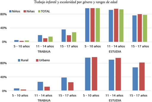 La figura 2 aporta información relevante para entender la dinámica inversa entre la escolaridad y el trabajo infantil en Colombia. Al analizar el grupo de menores que estudian (independientemente de que trabajen o no), se observa que el rango etario de quince a diecisiete años tiene una diferencia negativa de 20 puntos porcentuales frente al rango de cinco a diez años (78,16%-97,21%)1, llegando a 28 puntos porcentuales en el área rural. Ahora bien, al comparar esta misma variable por género, se evidencia que en todos los rangos de edad hay más niñas que niños estudiando, mientras que cuando se analiza el grupo de menores trabajadores (sin importar que también asistan a la escuela), son mayoría los niños en todos los rangos de edad.