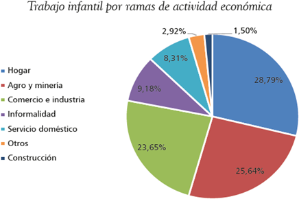 Los sectores económicos que absorben la mano de obra infantil se muestran en la figura 3. Al respecto, cabe señalar que la mayor proporción de NNA trabajadores se dedica a realizar oficios en su propio hogar (28,8%), seguido por quienes son empleados en actividades agrícolas, pecuarias y mineras (25,6%), en operaciones comerciales e industriales (23,6%). La informalidad, frecuentemente relacionada con las ventas ambulantes y los trabajos en la calle, ocupa un porcentaje considerable de menores (9,2%), así como los quehaceres domésticos en hogares ajenos (8,3%). Contrario a lo que podría esperarse, en Colombia el sector de la construcción solo ocupa al 1,5% de los trabajadores infantiles; el restante 2,9% se dedica a otras actividades, dentro de las cuales se pueden mencionar las reparaciones en talleres mecánicos, los servicios turísticos y hoteleros, entre otras.