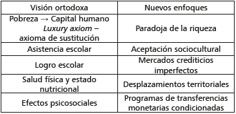 A partir de este estudio pionero, la investigación sobre el tema se hizo prolífica; a la fecha se ha realizado una vasta cantidad de trabajos que tratan de establecer sus determinantes económicos, sociales y culturales. Tradicionalmente, los análisis han atribuido la participación de NNA en actividades económicas a los elevados índices de pobreza multidimensional de sus hogares (Basu y Van, 1998; Blunch y Verner, 2001); no obstante, estudios más recientes han adoptado un enfoque ampliado que no desvirtúa la hipótesis de la pobreza, sino que consideran el trabajo infantil como un fenómeno multicausal. La tabla 1 resume los principales enfoques teóricos.