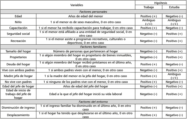 Siguiendo la notación de la ecuación [1], se define la variable Y1 como "trabaja" y Y2 como "estudia", siendo ambas variables dependientes binarias que están determinadas simultáneamente por factores idénticos; de este modo, "trabaja" es 0 cuando el menor no labora y 1 en caso contrario, en tanto que "estudia" es 0 cuando el menor no asiste a la escuela y 1 cuando sí lo hace. Dado que la principal preocupación de este análisis es determinar la influencia del contexto socioeconómico sobre las decisiones de los menores de trabajar o asistir a la escuela, se ha procedido a controlar por una serie de características personales, del hogar y del entorno. Los vectores X1 y X2 recogen la totalidad de variables explicativas consideradas. En la tabla 2 se definen estas variables indicando el signo esperado según la actividad que realicen los menores.