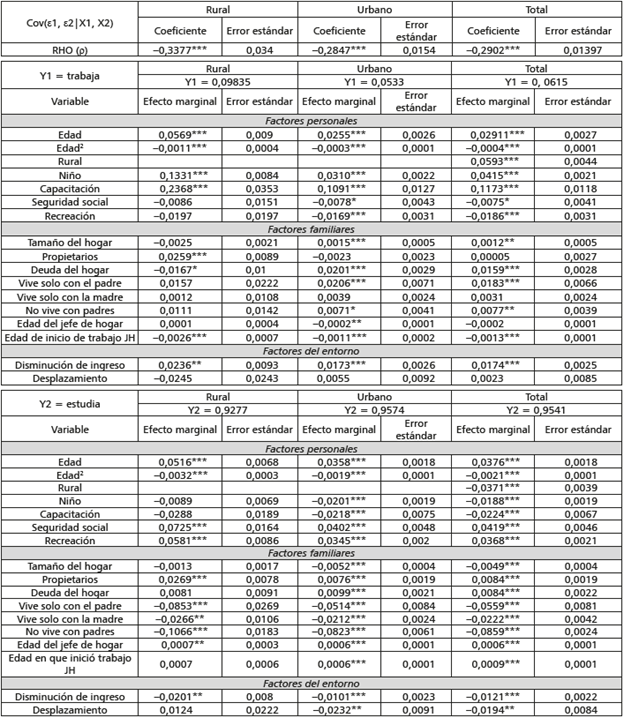 El modelo propuesto ha sido estimado para todos los menores de la base de datos, así como para rural y urbano separadamente, en razón de que se reconocieron algunas diferencias de género en la dinámica del trabajo y la escolarización. Para todas las regresiones, el coeficiente de correlación de Spearman (coeficiente rho, ρ) es estadísticamente diferente de cero y posee signo negativo, lo que confirma la hipótesis de que en Colombia el TI y la asistencia escolar tienen una relación inversa. Los efectos marginales sobre las probabilidades de trabajar y estudiar, derivados de los cambios en la magnitud de las variables explicativas, se presentan en la tabla 3. En general, los signos de los coeficientes son los esperados.