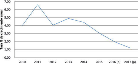 La evolución en el comportamiento del PIB (figura 1) durante el periodo 2010-2017 muestra una tendencia decreciente, esto es, una marcada desaceleración en el ritmo de crecimiento de la economía. Al observar el comportamiento por periodos más cortos (tabla 7), se puede observar que entre 2010 y 2012 el crecimiento del PIB rondaba entre el 4% y el 6,5%; sin embargo, entre 2012 y 2014 la cifra máxima fue de 4,9%, y a partir de 2015, con el impacto de la caída en la renta petrolera, se marca con más contundencia la desaceleración, pasando a tasas de crecimiento inferiores al 3%. Incluso para 2017 se proyecta que se ubique por debajo del 2%, lo que sin duda es un crecimiento demasiado bajo para un país "en vía de desarrollo", con alto grado de desigualdad y múltiples necesidades de inversión social.