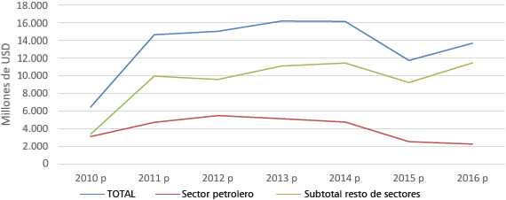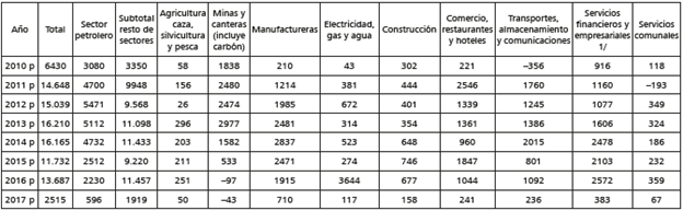 Lo anterior se explica en razón a la disminución en la caída de la inversión extranjera en el sector petrolero, que a la fecha no se ha logrado superar. Sin embargo, para 2016, el repunte en el nivel de inversión extranjera percibida por el resto de sectores permitió un repunte en la cifra total (tabla 8).