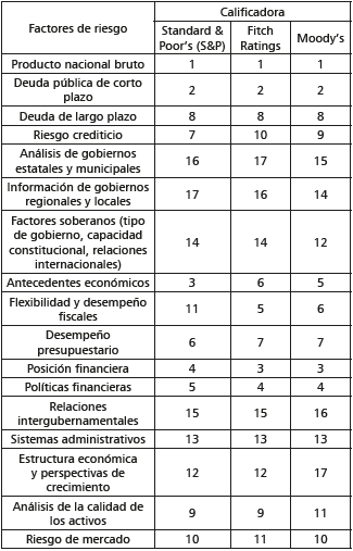 Además de estos riesgos, Morales (2006) y Acosta (2016) señalan que está el contexto económico, donde se evalúa el crecimiento del PIB, la tasa de desempleo, las perspectivas de inflación, el déficit fiscal y la cuenta corriente. Morales (2006) presenta los factores de referencia que tienen en cuenta las agencias calificadoras de riesgo en su metodología, según orden de importancia, para establecer el riesgo país de una nación (tabla 1).