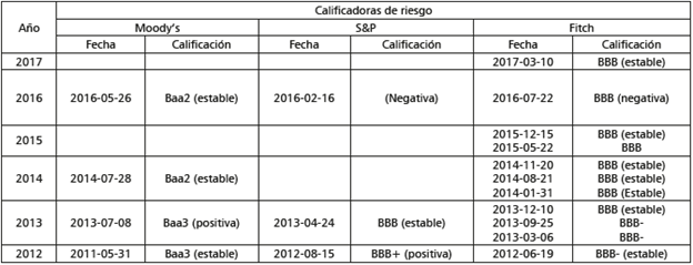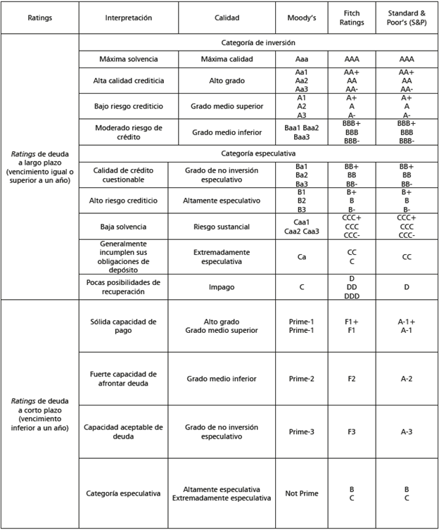 Existen tres grandes calificadoras en el mundo: Moody's, Fitch Ratings y Standard and Poor's (S&P), las cuales reportan calificaciones de deuda a corto y largo plazo de los países. Los inversionistas tienen muy en cuenta los movimientos entre estas calificaciones, en especial cuando cae el grado de inversión, lo que ubica al país en la zona de grado de inversión (Gandini, 2017). Por tanto, son un referente de análisis para la toma de decisiones frente a movimientos financieros y de inversión en el país y en el exterior.