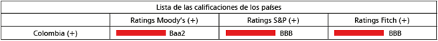Todo inversionista, antes de tomar decisiones, necesita conocer el nivel de riesgo y las probabilidades de rentabilidad y seguridad de sus movimientos financieros y posiciones en el país a invertir. Por lo tanto, el principal referente de análisis son las calificaciones emitidas por las calificadoras de riesgo país. Entre las agencias calificadoras de riesgo de mayor reconocimiento en Colombia se encuentran Fitch Ratings, Standard & Poor's y Moody's, que buscan hacer un seguimiento permanente y dar a conocer el factor de riesgo de donde se desea invertir, para así estar en capacidad de diseñar portafolios acordes, estableciendo si un país reúne las condiciones de confianza para los inversionistas o si, por el contrario, es riesgoso invertir en él según los estándares de la relación "nivel de riesgo-rentabilidad" de cada inversionista.