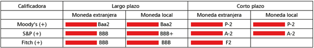 Anteriormente, se observaba que "cada calificadora tiene escalas diferentes, pero básicamente A es la más alta, B es buena, C es satisfactoria y E no alcanzan a clasificar para inversión" (Acosta, 2016). Un BBB significa que está por encima de un BBB-o un BB+, pero por debajo de un BBB+ o AA+ (tabla 2).