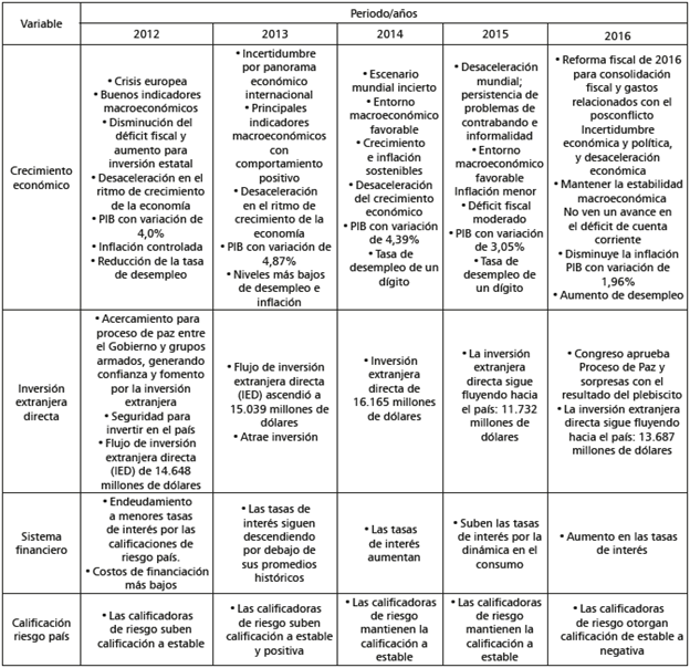 Colombia "debe perseverar por mantener su calificación de BBB, ya que sin este aval internacional la consecución de recursos a través de la emisión de bonos en los mercados de deuda se haría más compleja y, por supuesto, costosa" (Gandini, 2017). De esta manera, se observa el panorama económico de Colombia (tabla 6) con relación a las calificaciones de riesgo país, el comportamiento macroeconómico en relación con el PIB y la influencia en la inversión extranjera directa durante el periodo 2012-2017.