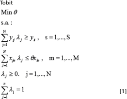 outputs. El valor obtenido para cada municipio s oscila entre los valores 0 y 1. La unidad correspondería a un municipio eficiente, con lo cual se construiría la frontera. La ecuación [1] asume implícitamente rendimientos variables de escala (RVE). Para estimar la eficiencia de escala, se debe resolver el problema anterior eliminando la restricción de convexidad