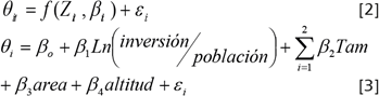 Donde Ln (Inversión/población) es la inversión en relación con la población realizada en educación, salud o agua, en millones de pesos. Doumpos y Cohen (2014) utilizan el volumen de las inversiones asignadas a los municipios en segunda etapa como variable explicativa, y como input en primera etapa. Tam es una variable dummy de tamaño que capturaría estar por encima o debajo del nivel medio de población del conjunto de regiones. Da Cruz y Marques (2014) incluyen la población dentro del grupo de variables relacionadas con la ciudadanía. D'Inverno, Carosi y Ravagli (2018) y Doumpos y Cohen (2014) emplean variables de tamaño de forma continua o categórica. Finalmente, Cordero et al. (2017), D'Inverno, Carosi y Ravagli (2018) y Da Cruz y Marques (2014) utilizan el área o la altitud como variables explicativas. En concreto, estos últimos autores consideran el área y la altitud como factores determinantes de carácter espacial y topográfico, respectivamente.