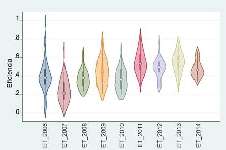 Los resultados obtenidos en la figura 1 revelan los cambios acaecidos en la forma externa de la distribución de la eficiencia en los años analizados. Como puede observarse, se producen cambios en la distribución; por ejemplo, la enorme dispersión de la eficiencia en 2006 en correlación con los años consiguientes, especialmente el marco temporal que abarca el periodo 2012-2014.