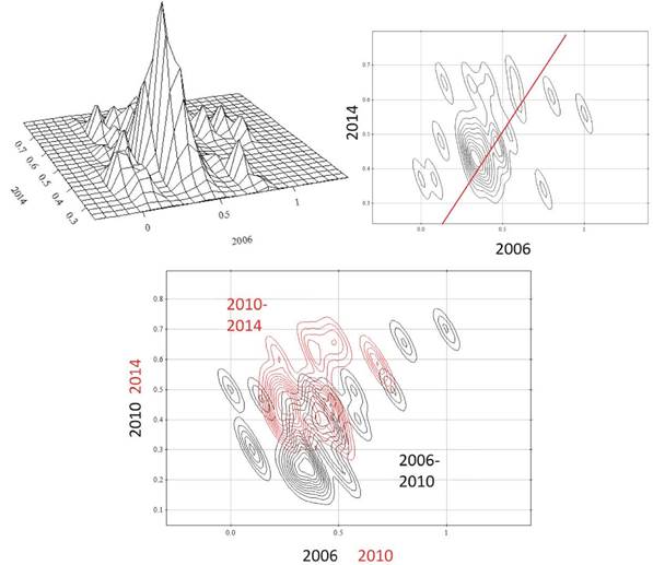 En la parte tridimensional de los gráficos, el eje X representa los valores de la eficiencia en 2006 o 2010, el eje Y representa los valores de la eficiencia 9 o 5 años después (es decir, 2006-2014, 2006-2010 o 2010-2014), mientras que el eje Z representa la densidad (probabilidad condicionada) de cada punto en el espacio X-Y. Las líneas paralelas a 2014 muestran la probabilidad de transitar desde el punto que se considere en el eje X a cualquier otro punto en el eje Y.