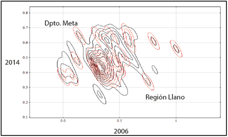 En relación con la totalidad de municipios en Colombia para el periodo 2006-2014, la masa probabilística se sitúa en la parte superior de la diagonal. Una forma más sencilla de analizar este fenómeno se refleja en el mismo gráfico por medio de los diagramas de contorno, que representan cortes paralelos a la base del kérnel (espacio X-Y), a alturas equidistantes. Se trata, por tanto, de puntos de igual altura y densidad.