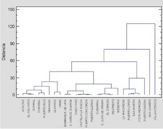 Este apartado inicialmente presenta las características de los municipios analizados del departamento del Meta. La tabla4 y la figura 4 presentan la heterogeneidad de la muestra a través del método Ward; la distancia euclidiana de municipios como San Juanito o Villavicencio aparecen anidados en el proceso final. San Juanito, por ejemplo, es el municipio de menor temperatura y mayor altitud, frente a Villavicencio, que tiene la mayor población y densidad poblacional.