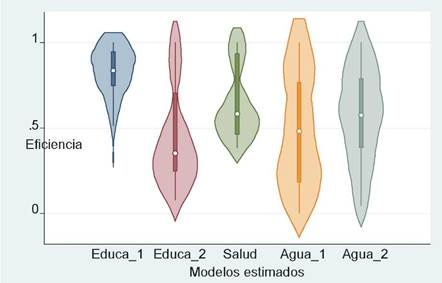 Como puede apreciarse en la penúltima fila de la tabla 6, el nivel de eficiencia media por modelos y sectores se sitúa en 81,3%, 49,7%, 66,6%, 52,8% y 62,0% para los modelos 1 y 2 de educación, 3 de salud y 4 y 5 de agua, respectivamente. Los RVE indican que los municipios, según sus respectivas actividades, podrían reducir sus inputs en los valores complementarios a 100%. La figura 5 muestra los gráficos violín según los modelos estimados. Los modelos Educa_1 y Salud observan la menor dispersión y los valores de eficiencia en general más elevados, frente a los otros tres modelos con mayor dispersión y menores niveles de eficiencia.
