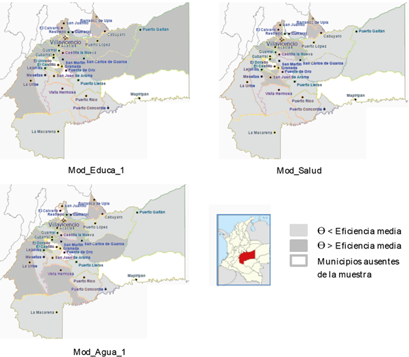 Un análisis realizado con mayor detalle, utilizando la frontera de la eficiencia media global de todos los municipios según modelos y actividades como referente o benchmarking, muestra que 16 municipios (29,6%) se encuentran por encima del nivel de eficiencia medio en educación, 10 municipios (18,5%) lo están en salud y 13 municipios (24%) lo están en agua.