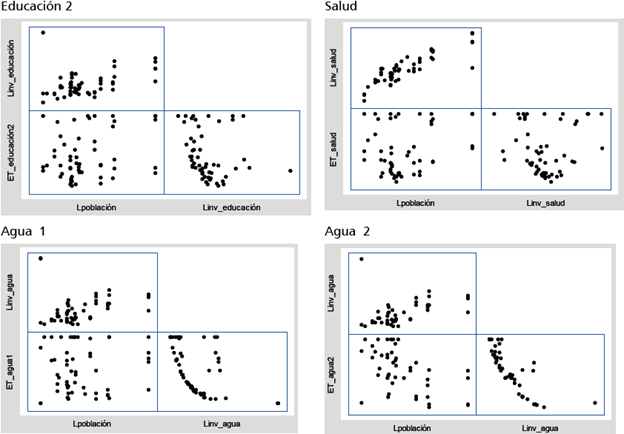Una vez analizada la eficiencia técnica en el anterior apartado, el próximo paso es estudiar los factores que la explican. Se procede inicialmente a un análisis descriptivo bivariante. En los gráficos de dispersión de la figura 7 se muestran las relaciones entre las inversiones, la población y la eficiencia estimada para cada modelo. Como puede apreciarse, existe una relación positiva entre los niveles de inversión en educación/salud o agua y la población (parte superior de cada figura). Asimismo, la relación entre la eficiencia estimada en la primera etapa y la población e inversión muestra que tanto poblaciones como inversiones pequeñas/grandes se sitúan en la frontera de referencia. En el caso del modelo Agua-2, esta relación está más limitada a los valores más reducidos.