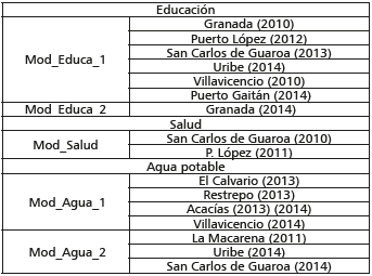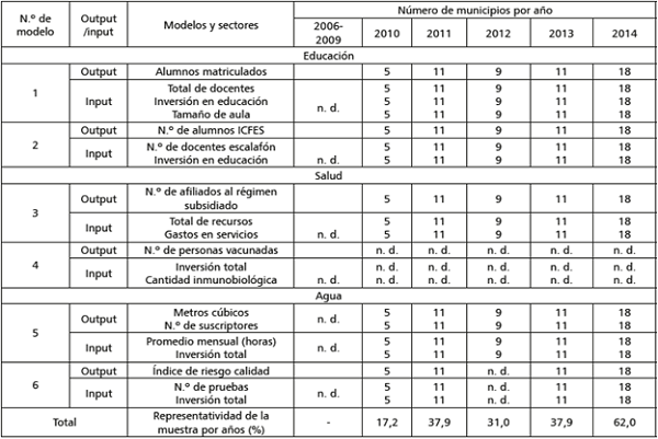 La disponibilidad de los datos permite trabajar con cinco de los seis modelos: dos referidos al sector de la educación (modelos 1 y 2), uno al sector de la salud (modelo 3) y dos al sector del agua (modelos 5 y 6). En relación con el criterio temporal, la estructura de la base de datos no es de tipo panel y, por tanto, no es posible aplicar metodologías en esa dirección (ver anexo). En relación con la representatividad de la muestra que figura en la última fila de la tabla 2, esto se ha realizado comparando la información disponible en relación con los 29 municipios existentes. En Prado y García (2007) puede encontrarse una relación de estudios según su representatividad, aunque asociado con el procedimiento de encuestas. Esta representatividad oscila entre el 5% para municipios en España (Vilardell, 1989) y el 73,38% (Distexhe, 1993) para municipios en Francia (Distexhe, 1993).