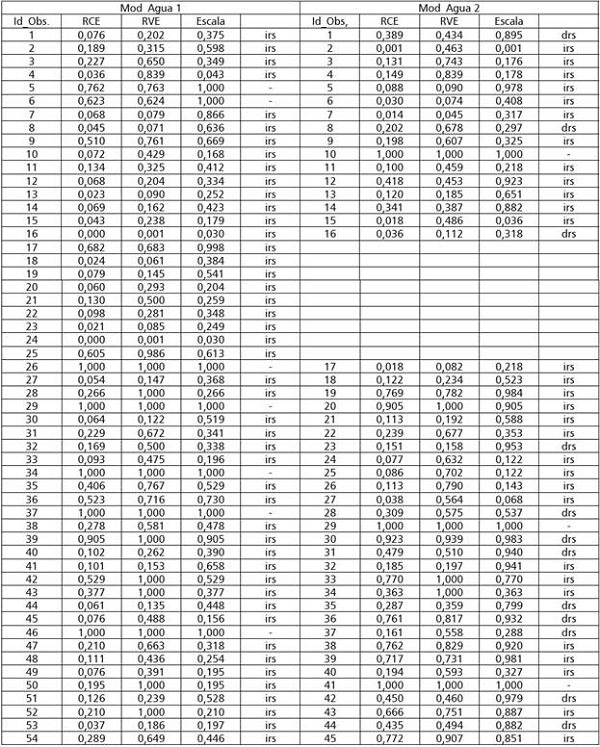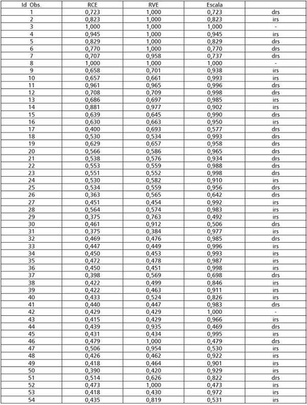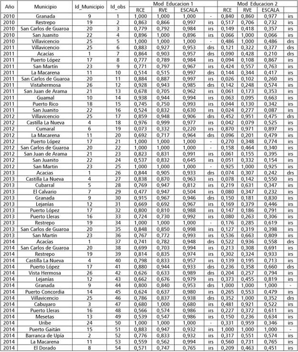 Si SEi = 1, la unidad de decisión (DMU) -en este caso, los municipios analizados- opera con eficiencia de escala, mientras que si SEi <1, indica la presencia de ineficiencias de escala. En este trabajo se opta por mantener el criterio de la DNP; por tanto, orientación input y RVE.