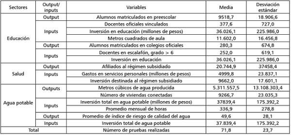 En este caso, la información consiste en utilizar los análisis de la eficiencia global realizados por esta institución. Para ello, se contemplan al menos dos supuestos: a) asumir como válido que todos los municipios de Colombia utilizan la misma tecnología y, por tanto, es posible estimar una única frontera de producción (en paralelo, se considera la orientación input y la opción de rendimientos variables de escala), en lugar de una frontera por región/departamento o un análisis metafrontera; b) el índice de eficiencia global, calculado a partir de los seis modelos y tres sectores mostrados en la tabla 1, no presenta problemas relativos, por ejemplo, a la heterogeneidad intrasectorial.