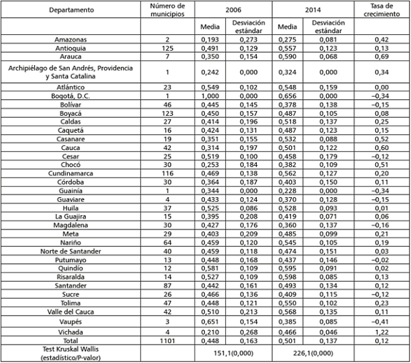 Los valores medios de la eficiencia global que se muestran en la penúltima final (la última fila recoge las diferencias estadísticamente significativas entre los departamentos en función del número de municipios) son del 44,8% y 50,1% para los años 2006 y 2014; es decir, los niveles de input se podrían reducir en un 55,2% y 49,9% para los años considerados. En este sentido, es conveniente recordar que la estimación de una única frontera de producción está seriamente afectada por la heterogeneidad presente en los 1101 municipios analizados, así como por la agregación realizada de las estimaciones DEA en un solo índice. La tasa de crecimiento que aparece en la séptima columna muestra la mejora del 12% de la eficiencia en términos medios. En general, la mayoría de municipios mejoran (72,27%): Vichada (122%), Arauca (69%), Cauca (60%), Casanare (52%), Choco (51 %), entre otros. Tan solo nueve departamentos experimentan decrecimientos (27,73%): Vaupés (-41 %), Bogotá y Guainía (-34%), entre otros.
