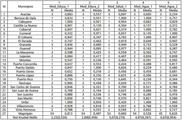 Un análisis con mayor detalle de la tabla 6 muestra cómo algunos municipios se encuentran posicionados en la frontera eficiente; por ejemplo, Uribe (8=1), en tres de los cinco modelos y con una observación por modelo. También es interesante observar el municipio de Villavicencio, que con una densidad poblacional elevada (mayor presupuesto, pero mayor prestación de servicios), mantiene elevados niveles de eficiencia (ϴ > media), con excepción del modelo de agua 2 (última columna).