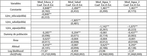 Los resultados globales a partir de los modelos planteados de la ecuación [3] se muestran en la tabla 8. Como puede apreciarse, el logaritmo de la inversión/población para todos los modelos asignados es negativo y estadísticamente significativo. Este resultado podría relacionarse con el mayor control de la inversión que puede realizarse optimizando los recursos asignados. La variable dummy de tamaño muestra que los municipios en las regiones más pobladas son más eficientes, cuando se trata de educación y salud; sin embargo, con el agua los niveles de eficiencia son mayores en las regiones menos pobladas, para el modelo agua2. Las variables área y altitud son estadísticamente significativas y positivas en el caso de la educación. Así, municipios como Puerto Gaitán, La Macarena y Uribe son referencia por su extensión geográfica, mientras que San Juanito, Lejanías, Uribe o Mesetas lo son por su altitud. Igualmente, esta variable mantiene este mismo impacto para los modelos del agua.