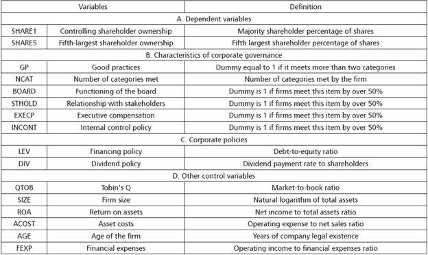 The research-dependent variable is ownership structure, which is measured through two proxies. The SHARE1 variable measures controller shareholder ownership as a way of calculating ownership concentration, while SHARE5 measures minority shareholder ownership, and therefore ownership structure dilution. These measures follow the suggestions of various studies (Santiago & Brown, 2007; Morales et al., 2013).
