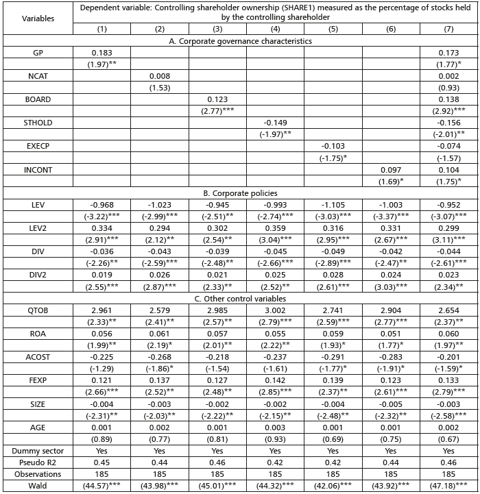 Finally, corporate governance variables presented mixed results. On the one hand, the majority development of good corporate governance practices (GP), the functioning of the board (BOARD), and internal control policies (INCONT) are variables that have a positive and significant impact on controlling shareholder ownership. These results validate the H5 hypothesis. The effects of these variables indicate that ownership concentration is based on the strengthening of control mechanisms and a better decision-making process (Fama & Jensen, 1983a, 1983b; Zahra & Pearce, 1989; Brown & Caylor, 2004).