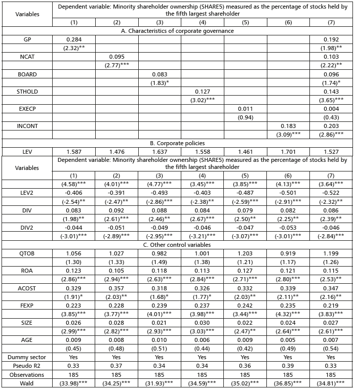 Such is the case of company returns on assets (ROA), financial expenses (FEXP), and firm age (AGE). In addition, the variable that quantifies growth opportunities (QTOB) does not have a significant effect on minority shareholder ownership.