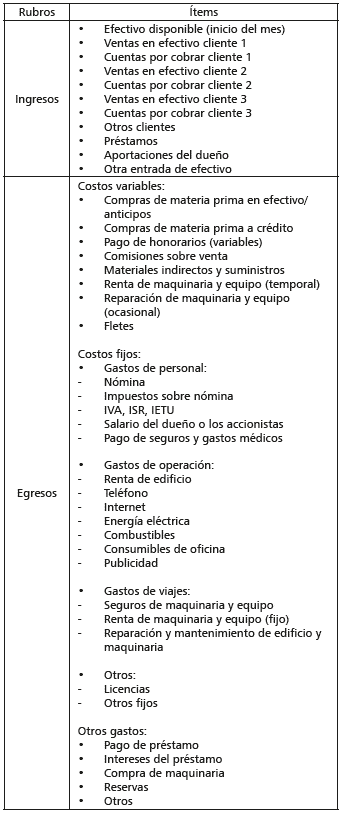 Es importante señalar que estos rubros son solo ejemplos por utilizar durante el desarrollo del ejercicio; el empresario podrá utilizar cualquier otro concepto que considere conveniente durante las dos horas en las que dura el ejercicio. Esta metodología no pretende obtener el número exacto que tiene la empresa en su cuenta de cheques; el objetivo es tener una buena aproximación a la realidad y que el empresario entienda cómo usar la herramienta.