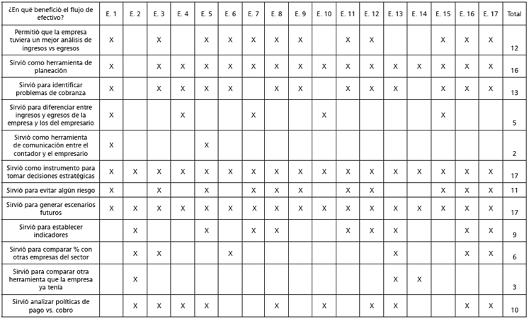 Como se ha mencionado, la intención de este trabajo es generar una herramienta estratégica, más no contable; es decir, el valor de esta metodología está en la estrategia, en el análisis detallado de las oportunidades internas y externas y en la generación de cultura ante el empresario y sus colaboradores. Los hallazgos permiten saber que existen una serie de anomalías en la administración del efectivo propias de las empresas de tamaño micro y pequeñas; y la principal razón de ello es la falta de una herramienta que, de acuerdo con necesidades específicas y elaborada por el propio empresario, permita controlar todas las operaciones de la empresa y brinde una visión clara del proceso de entradas y salidas de efectivo, así como de todas sus implicaciones.