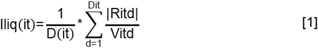 Donde Ritd y Vitd son, respectivamente, la rentabilidad y el volumen de negociación del activo i en el día d del trimestre t; y Dit representa el número de días que el título i es negociado en trimestre t; además, esta ratio se multiplicó por la constante 10 ^ 12 para tener un mejor ajuste de las series. Este indicador mide la asociación media diaria entre una unidad de volumen y el cambio en el precio. Otra posible interpretación o explicación de esta medida puede estar relacionada con el desacuerdo por parte de los inversores respecto a la interpretación que realizan de la nueva información llegada al mercado a medida que trascurren las ruedas de negociación (Amihud, 2002; Miralles et al., 2007).