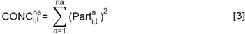 En el caso de esta variable, se adoptó el índice de Herfindahl e Hirschman como ratio de medición para la media de la concentración, teniendo en cuenta los primeros cinco accionistas por trimestre de cada empresa de la muestra. Para ello, se parte de la metodología adoptada por O'shee et al. (2008) y el Banco de la República (2008). Además, son los más representativos en cuanto a la participación de la propiedad, con base en [3]: