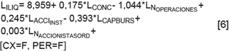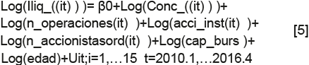 Para contrastar la relación entre liquidez y concentración de la propiedad accionaria, se estableció un modelo log-log, doble logaritmo o elasticidad constante, que generan linealidad en los parámetros; en este caso, los coeficientes representan la elasticidad de la variable (Y) con respecto a su variable (X), es decir, se genera un cambio porcentual en la variable dependiente para un cambio porcentual en la variable independiente o explicativa (Díaz, 2013). En este sentido, el modelo inicial planteado es el siguiente: