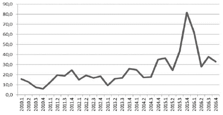 Por otra parte, el promedio generado en la iliquidez de las acciones para el periodo 2010-1 fue de 15,71, llegando a 33,99 en 2016-4, con una variación de 116,35% (un mínimo de 6,04 en 20104 y un máximo de 81,59 en 2015-4). Entre tanto, el grupo de acciones de economía mixta -es el caso de Ecopetrol, EEB, ETB e ISA- se comportó con menor iliquidez al inicio de la serie de estudio (2010-1); se destaca la acción de Ecopetrol, con el menor valor de iliquidez de 0,45 respecto a las demás acciones, mientras que las acciones de Mineros y Bogotá obtuvieron los valores más altos: 54,82 y 105,21, respectivamente.