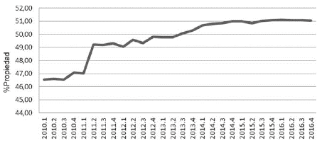 Se observó una tendencia alcista en la media de la participación en la propiedad por parte del primer accionista o principal al inicio de la serie, hasta mediados del 2014, cuando tiende a estabilizarse (gráfica 2). En ese orden de ideas, la media pasó de 46,55% en 2010-1 a un 51,06% en 2016-4, un incremento de 4,51% en ese periodo. En este aspecto sobresalen la mayoría de empresas de carácter mixto, donde la participación del Estado o de entidades públicas como principales accionistas es significativa, es decir, más de un 70% de la propiedad. Este es el caso de las acciones de Ecopetrol S.A., donde la nación, a través del Ministerio de Crédito Público, tenía una participación de 89,90% en 2010-1, la cual pasó a 88,48% en 2016-4 a causa de la enajenación realizada en 2011.