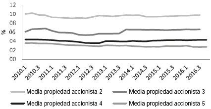 Respecto a la participación de los otros cuatro principales accionistas, se evidenció una disminución importante en contraste con el accionista principal, pues la media del segundo accionista se ubicó alrededor del 10% entre 2010 y 2016, en tanto para el tercero, cuarto y quinto accionistas su media estuvo alrededor del 6%, el 4% y el 3%, respectivamente (gráfica 3). En resumen, la concentración de la propiedad media entre los principales accionistas de las empresas del mercado bursátil colombiano fue del 70% y el 74% durante 2010 y 2016, respectivamente. Además, los tres primeros accionistas mantuvieron una concentración de 62,5% y 67,4% en el control de propiedad de las sociedades en ese mismo periodo.