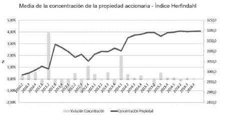 En la media de la concentración de la propiedad accionaria de los primeros cinco accionistas se evidenció una evolución creciente a lo largo del periodo de estudio, con picos de variación en 2011-2, 2014-1 y 2014-2, que coinciden con la emisión de acciones por parte de Ecopetrol, Banco de Bogotá y Bancolombia, respectivamente. En el caso específico del Banco de Bogotá, dicho aumento se presentó principalmente en la participación del primer accionista, que pasó de tener el 62,12% en 2013-4 a un 67,38% en 2014-2. Por otro lado, la media de la concentración a través de índice Herfindahl inició en 2938 en 2010-1 y terminó en 3198 en 2016-4, con una variación positiva de 7,2% (gráfica 4). Asimismo, durante los dos últimos años de estudio (2015 y 2016) se observó una pausa en la tendencia alcista de la concentración, pues la media mostró una variación positiva del 0,23%. Es importante aclarar que, según información suministrada por la BVC, durante ese periodo no hubo emisiones significativas de acciones.