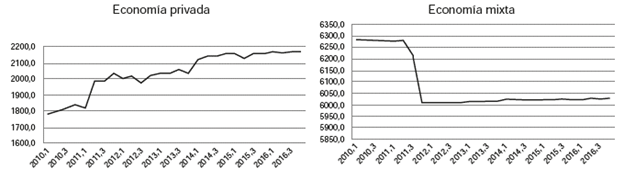 La media de la concentración por tipo de economía reveló una tendencia creciente en aquellas empresas de economía privada, pues el índice muestra un cambio positivo del 21,53%, pasando de 1783 en 2010-1 a 2168 en 2016-4. En contraste, la gráfica 5, sobre la media de las sociedades mixtas, mostró un decrecimiento en la tendencia en 4,04%, principalmente con la segunda emisión de Ecopetrol S.A., que se dio por parte de la nación y le restó porcentaje de participación. Esta serie asimismo generó periodos constantes o sin variación significativa.