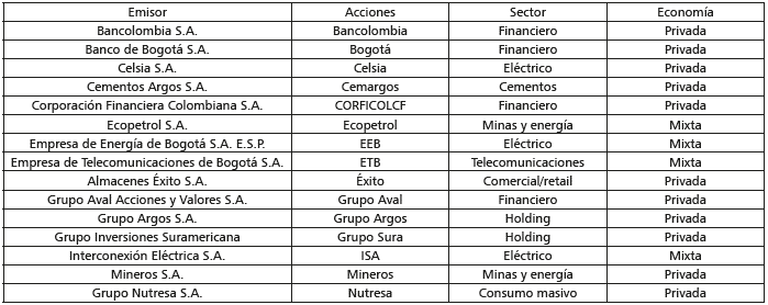 La muestra está compuesta en su mayoría por acciones del sector financiero y eléctrico, con una participación del 27% y el 20%, respectivamente; además, el 73% son empresas de economía privada y el 27% restante son de carácter mixto. De igual forma, Ecopetrol S.A. es la empresa más grande, con una capitalización bursátil, al 29 de diciembre de 2016, de 56 billones de pesos, en tanto Mineros S.A. es la más pequeña en ese aspecto.