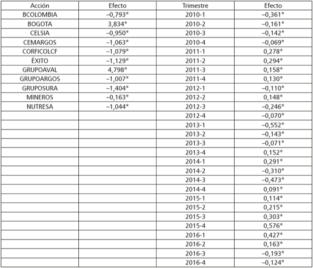 En la gráfica 1 se diagrama la media de la iliquidez por periodo trimestral para el total de la muestra. Se observó un comportamiento al alza a partir del último trimestre de 2012, que coincide con el escándalo de la comisionista Interbolsa ocurrido a principios de noviembre de ese año. Dicha tendencia al alza se incrementa hasta alcanzar un pico entre los últimos trimestres del 2015 y el primer trimestre del 2016; a partir de ahí se crea una tendencia a la baja en el corto plazo, lo cual coincide con el incremento acelerado de la tasa de cambio y la reducción en los precios del crudo, al igual que con cambios a nivel macroeconómico del país, como el aumento de la inflación y de las tasas de interés durante ese periodo.