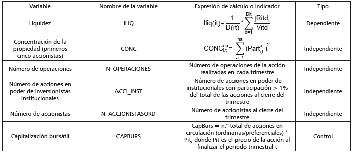 Para esta investigación se adoptó una metodología con base en la econometría: la metodología de datos de panel o longitudinales, con el fin de examinar los diferentes modelos que relacionan la concentración de la propiedad con la liquidez de las acciones, debido a la variabilidad de las diferentes empresas en cuanto a los datos de cada indicador. En ese orden de ideas, este tipo de metodología relaciona datos para (n) entidades individuales distintas en (t) diferentes periodos; es decir, incorpora las dimensiones temporal y la estructural al mismo tiempo. Asimismo, se pueden generar dos tipos de panel: uno balanceado o equilibrado, donde se disponen todas las observaciones para todas las variables, y otro incompleto, donde faltan algunos datos para al menos un periodo o una entidad de la muestra (Stock y Watson, 2012; Baronio y Vianco, 2014).