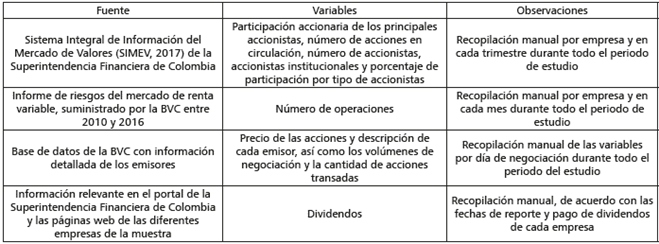 Debido a la ausencia de bases de datos consolidadas del mercado bursátil colombiano para el periodo de estudio (2010-2016), se recurrió a diferentes fuentes de información, principalmente a la BVC y la Superintendencia Financiera de Colombia, de donde se extrajeron de forma manual los diferentes datos que sirvieron como insumo para cada variable; a su vez, se construyó una base de acuerdo con los criterios de este trabajo de investigación. En la tabla 3 se describen las fuentes de información