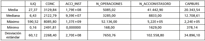 Se realizaron unos estadísticos descriptivos para las variables de la base de datos. En la tabla 4 se resalta la media de ILIQ de 27,37 y la CONC de 3129,84. El valor mínimo de la variable ACCI_INST cero corresponde a las acciones de Bogotá y Grupo Aval.