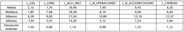 Los estadísticos descriptivos para las variables trasformadas mostraron una media para L_ILIQ, L_NPRECIO y L_CONC de 2,10, 9,07 y 7,76, respectivamente. Para este caso no aplicaron las observaciones de Grupo Aval y Bogotá en la variable de L_ACCI_INST; por eso el valor mínimo es de 15,30 en comparación con lo plasmado en la tabla 5.