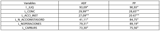 Para la metodología empleada también se comprobó la estacionariedad de las variables, a través del contraste de Dickey Fuller aumentado (ADF) y Philips Peron (PP). Los resultados se muestran en la tabla 6.